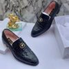 These loafers feature a black colorway, making them versatile and easy to pair with a variety of ensembles. The embossed crocodile effect adds a unique and eye-catching detail, while the gold-tone Greca plaque and Medusa Head motif on the vamp showcase the label’s Greek-inspired aesthetic.